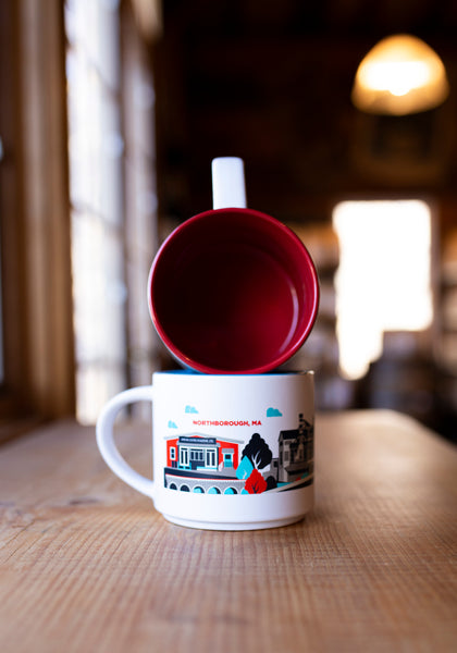 Take a sip from a mug dedicated to our hometown, Northborough, MA! Our Northborough mug is duo-toned, with your choice of either red or blue on the inside and a 360 illustration of Northborough landmarks on the outside!